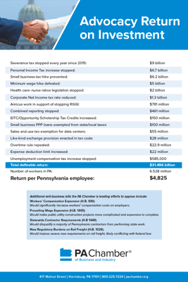 OUR success is YOUR success! Every time we notch a legislative or regulatory victory, it results in tangible savings for our members and businesses statewide. As our Advocacy ROI document lays out, whether the PA Chamber is leading the charge in enacting pro-business laws (such as the reduction of the Corporate Net Income Tax), defeating anti-growth measures (including the proposed tax on the natural gas industry), or helping small businesses thrive through access to loans, our efforts have helped to save Pennsylvania businesses $31.496 BILLION over the last several years, which equates to $4,825 for every employee!