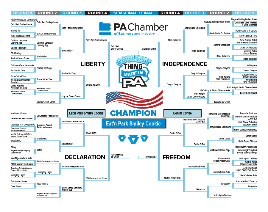 It’s Back! Pennsylvania is home to the coolest products made in America. From Hershey Bars to Harley Davidson Motorcycles, Zippo Lighters to Yuengling Lager, Crayola Crayons to Martin Guitars, the Keystone State is king in manufacturing – and we love to celebrate it!Enter “The Coolest Thing Made in PA” – a unique, engaging, bracket-style competition that pits made-in-PA brands against each other in match-ups determined by public voting.Our 2026 “Coolest Thing Made in PA” competition includes 64 made-in-PA products and encourages voting via the PA Chamber’s X, Instagram, TikTok and LinkedIn pages. This diverse, dynamic bracket includes brands across Pennsylvania industries and all regions of the Commonwealth, and we can’t wait for you to get in on the game.It all begins on Wednesday, March 12, at this year’s bracket unveiling. Voting will begin at Noon on Tuesday, March 18, and will continue each week through mid-April. We encourage employers, customers, and brand lovers across Pennsylvania and beyond to turn out the vote on X and Instagram throughout this fun-filled contest and showcase their love for their made-in-PA favorites! TOURNAMENT VOTING SCHEDULE First Round (64): March 17 – March 20 Second Round (32): March 24 – March 25 Third round (16): March 26 – March 27 Fourth round (8): March 31- April 1 Semi-finals (4): April 2 – April 3 Championship: April 6 – April 7 How To VoteVoting will take place on the PA Chamber’s X page for the duration of the round. An additional vote will be able to be cast on our Instagram story, our TikTok story and our LinkedIn page during the last 24 hours of the round. The votes will be added together and the winner of the cumulative vote will be declared the winner. Printable Bracket (PDF) + 2025 Participants 100% Recyclable Deka BatteriesAcutec Aerospace ComponentsArmstrong Templok Energy Saving CeilingsAuntie Anne’s PretzelsAurora AVAveeno Daily Moisturizing Body LotionBassetts Ice CreamBayer Radiology Contrast Syringe KitsBell & Evans ChickenBig Barker Dog BedsBluett Bros. ViolinsBollman Hat Company HatsBrooklyn Dumpling Shop Classic DumplingsChef Boyardee PastaCrayola CrayonsDalessandro’s CheesesteaksDelGrosso Pasta SauceDenim CoffeeDS StovesDuolingo Language Learning AppDutchWare Gear HammockDuraEdge MLB Infield Dirt Eat’n Park Smiley Cookies Energy-Saving Solarban® Glass by VitroEOS Z3 BatteryGardners Peanut Butter MeltawaysGreat Eastern CutleryHarley Davidson MotorcyclesHope’s CookiesJoy Ice Cream ConesKenvueKIT KAT BarK’NEXLockheed-F-35 ComponentsMack Defense Lakota 6×6 Armoured VehicleMartin & Co. GuitarsMiddleswarth Potato ChipsMitsubishi-Electric Power ProductsNew Holland Farm EquipmentNew Pig Absorbent MatsPA Hardwood ProductsPA Made SteelPA Natural GasPainterland Sisters Organic YogurtPeeps PPG Organic Light Emitting Diodes (OLEDs) Pride Mobility ScootersPSU Creamery Ice CreamPurple Lizard Outdoor Adventure MapsResilite Specialty Wrestling MatsRGM Watch Co. WatchesRita’s Italian IceSheetz MTOSmith’s Hot DogsSweet Street DessertsTaylor Chip CookiesTroegs Mad ElfVictory Brewing Sour MonkeyWabtec LocomotivesWelsh Mountain Candle Co. CandlesWest Shore Home 2-Day Full Bathroom RemodelWildcat Championship BeltsYuengling LagerZimmerman ShoesZippo Lighters PAST Results 2024: Click here to download a pdf of the 2024 bracket. 2023: Click here to download a pdf of the 2023 bracket. Hall of Fame The Primanti Brothers SandwichTwo-time Coolest Thing Made in PA Winner