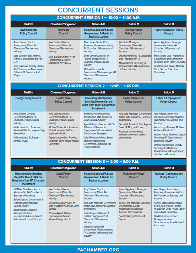 The PA Chamber Policy Summit is organized around the work of the Chamber’s various Policy Councils, and each council will host its own dedicated session during the event. Here’s how the flow works: